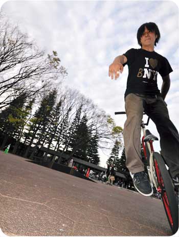 BMXに乗ったまま様々なトリックを決めて、そのワザの完成度、難易度、オリジナリティを競い合います。世界選手権では日本からチャンピオンが何人も出るなど、日本のフラットランドシーンは世界最高レベルにあります。