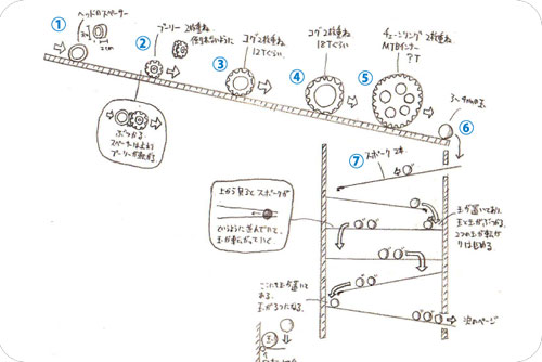 身の回りにあるビー玉や小さな車、定規や本などが使われ、最初にきっかけを与えると連鎖的な運動が進行し、あるいは転がっていった先で次のものにぶつかって運動が引き継がれていくという装置です。